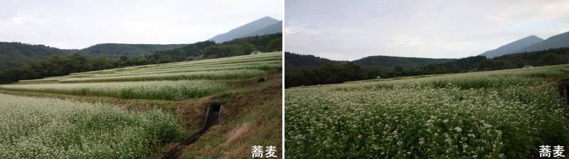 昔から各家庭の手打ち蕎麦は、蕎麦粉100%使用のつなぎがない「十割」です。長年の勘で蕎麦粉も水も目分量で、耳たぶほどの硬さにこね上げます。一般的にこねる際は、蕎麦粉のでんぷん質を引き出すため熱湯を加えますが、この蕎麦粉には粘り気があるので、ぬるま湯でも比較的楽にこねることができるといいます。切り幅が2mm(一般的に1.5mm ほど)と少し太めで、芳醇な蕎麦の香りを楽しむことができます蕎麦は、水はけの良い場所を選びます。茎の背丈を高く育てると、風で倒れて病気になりやすい事から、堆肥のみを使用するか、カリや過リン酸など背があまり伸びにくい肥料を使用します。一般的には種を蒔いてから収穫するまでの期間は「蕎麦75日」ともいわれていますが、代々「お彼岸の40日前ははずれない」と言い継がれており、種を蒔く時期は、秋彼岸より40日前の8月16日頃で、畑にばら蒔きをします。4日目あたりで発芽し、1か月ほどで白い小さな花を付けます。