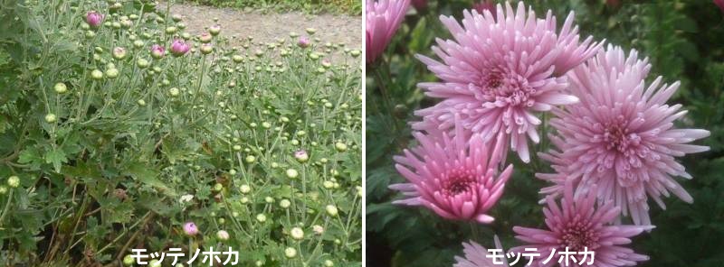 モッテノホカは、秋菊で来歴は明らかでありません。花色は淡紫色あるいは紫紅色で地域によってばらつきがあります。花弁は管弁、半管弁の八重で中輪です。花びらが筒状のためシャキシャキした歯ごたえがあり、ほのかな香りや甘み、ほろ苦さが特徴です。名前の由来は、「天皇の御紋である菊の花を食べるとはもってのほか」とか「もってのほかおいしい」といった事から名づけられたと云われています。山形県は、食用菊(刺身などのつま用の小ぎくを除く)の生産が盛んで東京都中央卸売市場で扱う5割程度を山形産が占めています。特に、独特の香りと味の良さで『食用ぎくの横綱』と評されるのが、淡い紫色の「もってのほか」です。正式には「延命楽」という品種ですが、県内では「もってのほか」の愛称が一般的です。もってのほかは晩生で、収穫は10月下旬頃から。花びらが筒状に丸まった管弁なので、しゃきしゃきとした歯ざわりに特徴があります。10月上旬から収穫できる「早生もって」もあります。