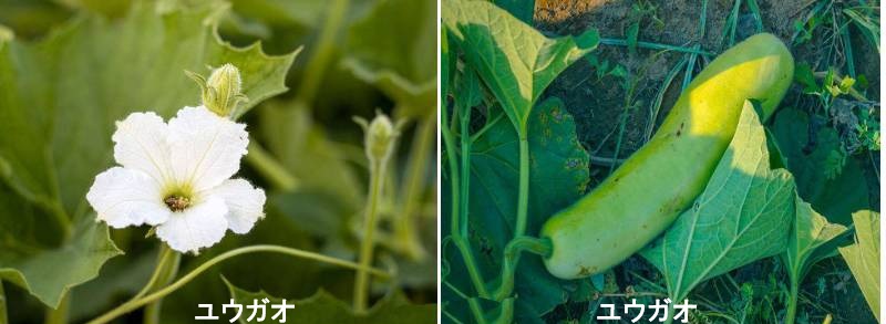 ユウガオはアフリカまたは熱帯アジア原産のウリ科の蔓性一年生植物です。葉、蔓、果のいずれも軟毛が生えており、夏の夕方、葉腋に直径5~10cmほどの大形の白色合弁花を開花させます。しかし、翌日午前中にはしぼんでしまう、はかない命の花です。8月の前半は真夏の太陽が容赦なく照りつけ、日中は暑さのために木々の緑も弱々しく見えます。しかし、夕暮れが迫って辺りが薄暗くなってくると、大形の白いユウガオの花が目立つようになります。淡く澄んだ香りを漂わせ、夕闇にほんのり浮かぶ姿はとても優雅です。中河興一の小説『天の夕顔』の最後に、ユウガオが好きだった亡き恋人を思って夜空に花火を打ち上げる場面があります。 花火が消える時、天にいるその人がユウガオを摘み取ったと思い、自らの喜びとするのが印象的です。夕顔の実を薄く削って干したものがかんぴょうになります。 ずんぐりとした球形の丸夕顔と円筒状の長夕顔といった種類があり、苦みの少ない丸夕顔が伝わったことをきっかけに食べられるようになったとされています。 かんぴょうに使用されるのも丸夕顔です。