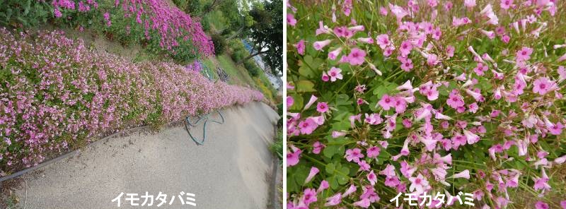 園芸界では、観賞用に栽培されるカタバミの仲間を総称してオキザリスと言います。美しい赤紫色の花を咲かせるイモカタバミは、同じ仲間のムラサキカタバミとともに古くから栽培されるオキザリスのひとつです。タネはできませんが、地中に塊茎と呼ばれるイモを次々とつくり、これが拡散することで繁殖していきます。この増える力はとても強く、ちぎれた塊茎のわずかな断片もすぐに再生して新しい株として育っていきます。塊茎の断片が土とともに移動するなどして、いたるところで野生化しています。春から秋にかけて、直径1.5センチメートルほどの赤紫色の花を多数咲かせます。ムラサキカタバミに似ていますが、花の中心は濃い赤紫色です。ときに白い花を咲かせる株もあり、シロバナフシネハナカタバミまたはシロバナイモカタバミと呼ばれます。