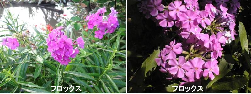 フロックスの仲間は67種が知られて、草丈1mを超えるものから、岩場に張りついてクッション状に育つもの、常緑、落葉、一年草、多年草と、非常に変化に富んで、花が美しいので観賞植物として多くの種が栽培されています。フロックスはハナシノブ科の園芸品種がとても多い草花です。フロックス属は種類が豊富な植物ですが、園芸店で「フロックス」の名で販売されているのは、大きく分けると「一年草」と「宿根草」があり、それぞれ開花時期や草丈などが違います。一年草のフロックスの開花時期は、春から初夏です。花色がとても豊富で、最近はベージュなどのシックな色や、スターフロックスと呼ばれる星形の咲き方がユニークな品種もあります。上にも伸びますが、横に広がるように分枝しながら生長し、適切な手入れをすると一株でもたくさんの花が次々と開花します。「宿根フロックス」の名で流通しているフロックスの開花時期は、初夏から秋です。株元からたくさんの茎を出し、まっすぐ茎を伸ばし、頂点に花をつけます。暑さに強く、植えっぱなしで毎年開花し、長期間開花し続けるため、初夏から秋の庭や花壇を華やかにしてくれます。以前は草丈が高いものが主でしたが、近年は矮性種も登場しています。
