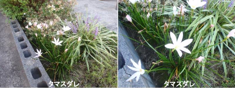 タマスダレは、夏から秋にかけ、雨の後に一斉に白い花を咲かせる球根植物です。名前は「玉」のような白い花と、細長い葉が集まる様子を「すだれ」に見立てて付けられました。丈夫で植えっぱなしでも育ち、分球やこぼれ種で増えるため、庭の縁取りなどにもよく利用されます。別名「レインリリー」とも呼ばれ、植物全体に毒性があるため、食用の植物とは離して植える必要があります。夏から秋にかけ、細長い葉とは別に伸びる花茎の先に、真っ白な6枚の花弁を持つ花を咲かせます。花は数日ほどで終わりますが、次々と花茎が上がって長期間楽しめます。白い小さな花を「玉」に、細長い葉が集まっている様子を「すだれ」に見立てて「玉簾(タマスダレ)」と名付けられました。タマスダレはヒガンバナ科の植物であり、植物全体に毒性があるため、誤って食べないように注意しましょう。葉がニラに、球根がラッキョウなどに似ているため、食用の植物と混同しないよう注意が必要です。