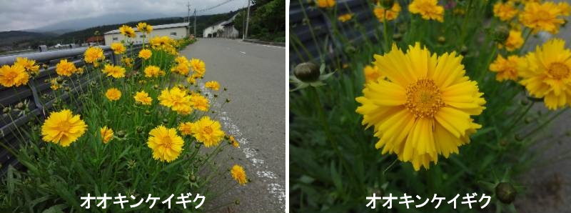 オオキンケイギクは北米原産の多年草で、5月~7月にかけて黄色のコスモスに似た花を咲かせます。強靱でよく生育することから、かつては工事の際の法面緑化に使用されたり、苗が販売されたりしていました。しかし、あまりに強く、いったん定着してしまうと在来の野草の生育場所を奪い、周囲の環境を一変させてしまうため、平成18年に外来生物法に基づく特定外来生物に指定され、生きたままの運搬や栽培、譲渡などが原則として禁止されました。九州地方環境事務所ではオオキンケイギク駆除の啓発に努めており、各自治体等に対し、チラシの配布等を行っております。キク科の多年生草本で、高さは30㎝~70㎝程度になります。開花期は5~7月、とても強靱で繁殖力が強く、かつて観賞用・緑化用として国内に導入され、道路の法面緑化等に使用されていたほか、ポット苗で園芸植物としても流通していました。