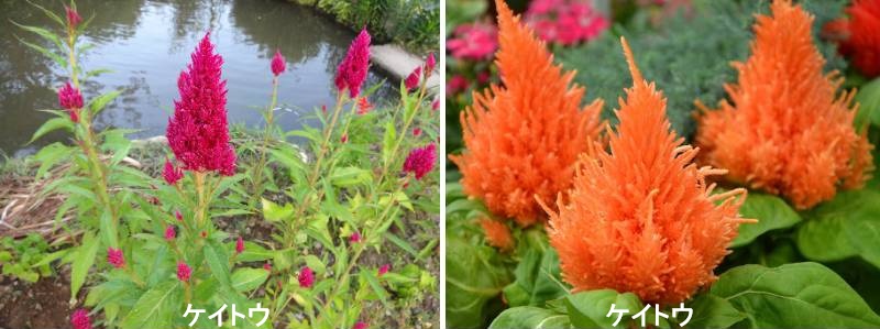 ケイトウは、日本には野生種は存在せず、インドなどの熱帯アジア原産の植物です。平安時代以前に大陸から渡ったとされ、万葉集に「韓藍(カラアイ)」の名称で登場しています。日本原産ではない植物ですが、日本の気候が生育に適するため、日本での品種改良が盛んで、世界で園芸品種や切り花品種として流通しているケイトウはほぼすべて日本で育種されたもののようです。「花に見える部分は本当は花ではなく、隠れて小さい花が付いている」というパターンの植物は、アジサイやカラーなど、とても多いですが、ケイトウの花もそのタイプです。ゴツゴツしたコブのようなトサカゲイトウも、フサフサした羽毛ゲイトウも、花に見えるのは茎の先が変形した「花序(かじょ)」(もしくは花穂)です。