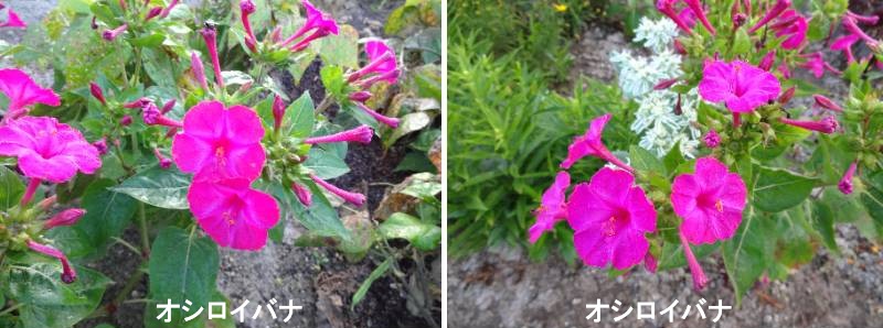 オシロイバナは、黒い果実(種子)を割ると、白い粉質のもの(胚乳にあたる部分)があり、それがおしろいの粉のようなので、この名がつけられています。日本には江戸時代に入り、各地で野生化しているものも多く見られます。タネをまいて容易に育てられるので、一年草扱いにされることも多いのですが、本来は多年草です。花は夕方4時ごろから開き、翌朝まで咲いていて、天気などにもよりますが、午前中にはしぼんでしまう一日花です。でも、夏の間ほとんど途切れることなく次々と咲き続けるので長く楽しめます。夜間に観賞できるような場所に植えるとよく、さわやかな香りも漂います。白花や黄花のものは、暗がりの中でも浮き上がるように花が目立ちます。花はろうと形で大きく開き、花径は3cmくらい、筒の部分は細長く5cmくらいあります。花弁はなく、花弁状の部分は萼片で、つけ根にある萼のような部分は苞にあたります。品種名のないものがほとんどで、花色は赤、オレンジ、黄色、ピンク、白があります。絞り咲きや咲き分けのものでは、1株の中で花ごとに少しずつ花色が違う花が咲きます。