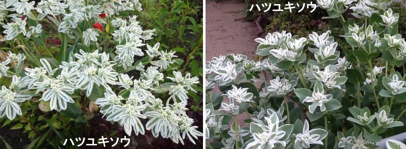 北アメリカ(ミネソタ、コロラド、テキサスなど)原産の一年草です。漢字を当てると「初雪草」、冬をイメージさせるような名前ですが、夏が見頃の植物です。具体的には春にタネをまくか苗を植え付け、夏から秋に鑑賞します。寒さには弱く、冬前には枯れます。花壇や切り花で楽しみます。なぜこんな名前なのかというと、茎頂に付く葉っぱの縁が白く色づき、その様子が薄く降り積もった初雪のように見えるからです。まとめて植えると名前どおり、まさに輝く雪のごとく見事な美しさです。英名の「スノーオンザマウンテン」、種小名の「マルギナタ(縁辺のある)」も同様に葉姿が名前の由来です。茎はまっすぐ直立して伸び、上の方で枝分かれします。草丈は1m前後に生長します。夏になると、色づいた葉っぱの中に埋もれるような感じで黄緑色の花を咲かせますが、小さくてあまり目立ちません。代表的な園芸品種に葉の色づきが早い「氷河」があります。