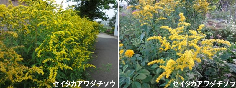 セイタカアワダチソウは、かつては園芸植物として栽培されたり、花の少ない時期の蜜源植物として養蜂業者が広めようとしたりと、どちらかといえば役に立つ植物としての位置づけでした。しかし、第二次世界大戦後、一気に雑草化し日本全国に広がり、今では荒れ地を覆いつくす勢いで繁茂しています。地下茎を張り巡らしながら広がっていく上に、大量の綿毛つきのタネをまき散らし、しかも多年草で株の寿命が長いため、目を見張るよう勢いで繁殖していきます。根からは他の植物の生育を抑制する成分を出しますが、自分で出した成分にやられて、勢いは次第に衰えつつあります。セイタカアワダチソウは、秋にいっせいに開花し、ピーク時には一面が真っ黄色になります。これが花粉を連想させるからでしょうか、かつては花粉症の原因として嫌われていました。ところがセイタカアワダチソウは虫媒花。その花粉はチョウやハチなどの昆虫に託し、空中にまき散らすことはありません。普通に生活している限り、花粉症の原因にはならず、とんだ濡れ衣を着せられた草と言えます。