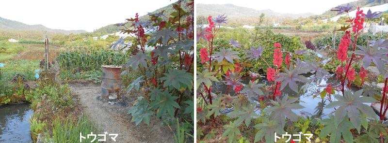 トウゴマはヒマとも呼ばれる中国原産の油用植物です。北アフリカ原産ですが、和名からは中国経由で渡来したことがわかります。日本では大型の1年草ですが、原産地では常緑で、電柱ほどの高さまで高くなると云います。種子から採れる油はヒマ子油と呼ばれ、強力な下剤として、医療にもちいられてきました。ヒマシ油は低温でも固まりにくいことから高高度を飛行する航空機の潤滑油としても利用され、第二次世界大戦前後では大量に栽培されたので、栽培経験を持つ人も多いです。当時の品種は花が緑色のものですが、現在栽培されているものは花や若芽が赤い「ベニヒマ(アカトウゴマ)」です。生花の花材として利用されますが、時折河原などに野生化したものが見られます。草丈は2mほどになり、直径30~40cmほどもある大きな葉をつけます。7つに深裂しますが、葉柄は葉の中央につきます。ベニヒマでは新芽は赤く、成葉は葉脈の部分が赤いです。花序は面白い配列であり、雌花が花序の上側に集まって付き、雄花は下側に付きます(この逆が多い)。花の赤さは、なるほどトウダイグサ科の色であると納得できます。赤い果実は褐色に熟し、3つに割れ、中に長さ1cmほどの種子が入っています。種子の表面は暗褐色の地に金色の文様があり、美しいです。じっと眺めていると、虫のようでもあり、クモの腹部を連想させます。