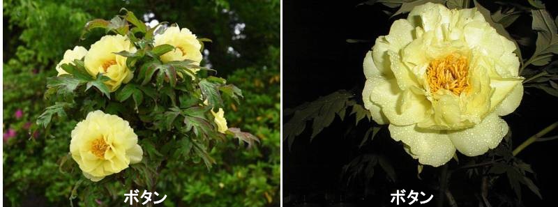 ボタンは美しさを象徴する植物であり、古くから、さまざまな工芸品や絵画の意匠としても用いられています。また、美しい女性の容姿や立ち居振る舞いが、「立てば芍薬、座れば牡丹…」と形容されてきました。ボタンは8世紀に、中国から薬用植物として渡来したといわれていますが、その後、観賞用にも栽培されるようになり、江戸時代には数多くの観賞用の園芸品種が生み出されました。しかしながら、江戸時代のボタンの品種は、わずかにその名をとどめるばかりで、現在栽培される品種の多くは、明治以降に作出されたものです。ボタンの野生種は、5種ほどが中国に自生します。このうち、ボタンは日本や中国で改良され、黄花の野生種ルテアは主にフランスで、また暗紅紫色の花をもつデラバイは、アメリカで交配親として用いられ、独自の品種群がつくられました。これらのボタンは、昭和初期に日本へ輸入されています。なお、ボタンとシャクヤクはともにボタン科ボタン属に含まれますが、ボタンは木本植物、シャクヤクは、冬期に地上部が枯れる多年生の草本植物です。