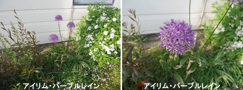 アリウムは、ニラやネギなども含む植物の総称です。食用として利用されているほかに、頭頂部に咲く球状の花を観賞するために、球根植物や宿根草として利用されているものも多くあります。アリウム ‘パープルレイン’は球根で育てるアリウムです。早咲きのパープルセンセーションと、クリストフィーの交配種で、丈夫で植えっぱなしもokです。アリウムも様々な種類があって、温暖地では、植えてから最初の年は咲かせられても、2度目3度目の季節に咲かない品種もありますが、このパープルレインは比較的に(もちろん、水捌け、日当たり環境が良ければ)と言う条件もありますが、春になると、たくさんの芽が出てきます。この芽出しの時の葉っぱもとってもきれいです。パープルレインなど比較的に球根が中位〜小さめ種類はほったらかしでも咲いてくれるので、頼もしいばかりです。