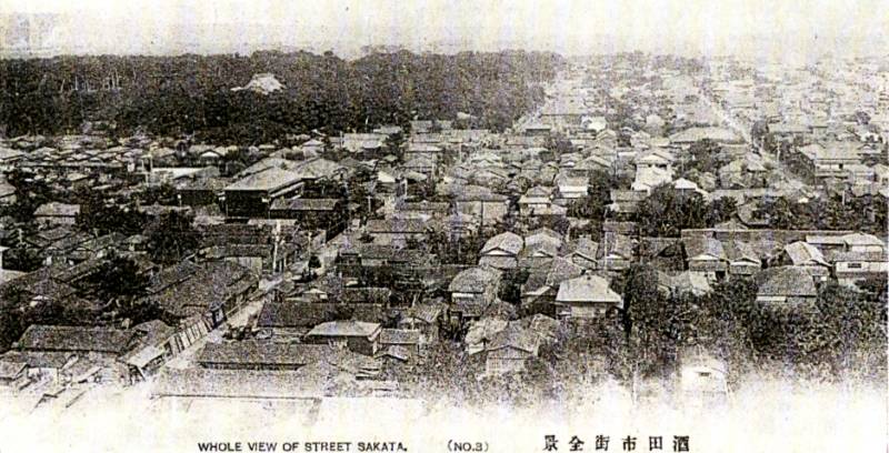 江戸時代までの酒田は、亀ヶ畸城分といわれた「内町組」「米屋町組」、向う酒田から移り住んだ36人衆たちが開拓した商人町である「酒田町組」の3地区に分かれていました。内町組・米屋町組は、文明10年(1478)ころに5丁野(現在の四ツ興屋辺り)から新井田川東岸に移転したといわれる東禅寺城(後の亀ヶ崎城)の城下町として形成されました(明治9年(1876)には鵜渡川原村となり、昭和4年(1929)に酒田町と合併しました。)。上杉家支配の慶長4年(1599)ころ、東禅寺城の外郭を新井田川西岸まで広げましたが、最上家の支配を経て、元和8年(1622)に酒井家が入部すると、武家屋敷を引き揚げて町屋敷となりました。その後、内町組・米屋町組と酒田町組との交通の便をよくするために、内町と本町1丁目の間を通した道「突抜(つきぬき)」を設け、同じころに外堀も埋めたといわれています。