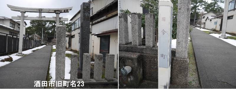 巖嶋神社入口近くに標柱があります。酒田市旧今町は、最上川舟運で栄えた酒田湊の秋田街道沿いにあった宿場町で、茶屋などが並び賑わった歴史的な地名です。現在は「北今町」などの地名に残るも、昔は五叉路の交差点の周辺に旅館や商店が集まり、明治から昭和にかけて道路整備でその姿を変えながらも、酒田の発展を支えた地域です。明暦年間(1657~1682年)に町割が行われ、秋田街道(現在の国道345号線)沿いに位置したため、多くの茶屋が軒を連ねる宿場町として栄えました。最上川の舟運と街道が交わる要衝で、特に「今町交差点」周辺は、明治から昭和にかけて道路の拡充・整備(駅方面への新道建設など)が進み、現在の五叉路の形になったのは昭和初期頃です。