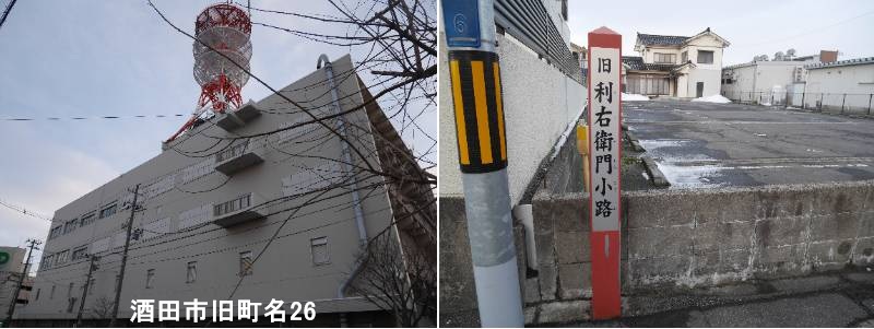 NTT東日本山形支社庄内営業所裏(西側)に標柱があります。酒田市旧利右衛門小路は、かつて酒田市の中心部にあった歴史的な小路(通り)で、現在の富重や大沼酒店付近の通りを指し、かつては酒田警察署(明治〜昭和32年)もこの近くにありました、酒田の町歩きガイド - 蔵屋敷のある街並み 歴史と商業の中心地でした。江戸時代から続く「酒田町・内町・米屋町」という酒田三町の構成要素の一つで、内町と米屋町を結ぶ交通の要衝として「突抜」と呼ばれる道が設けられた頃から存在しました。 明治時代から昭和32年まで酒田警察署が置かれるなど、行政・商業の中心として栄えましたが、飽海郡誌(複製画)- 酒田市現在は「利右衛門小路」という名称は住居表示の変更(昭和40年代)により使われなくなり、現在の「利右衛門小路」という通りの名前は、その歴史的な地名を受け継いでいるものです。