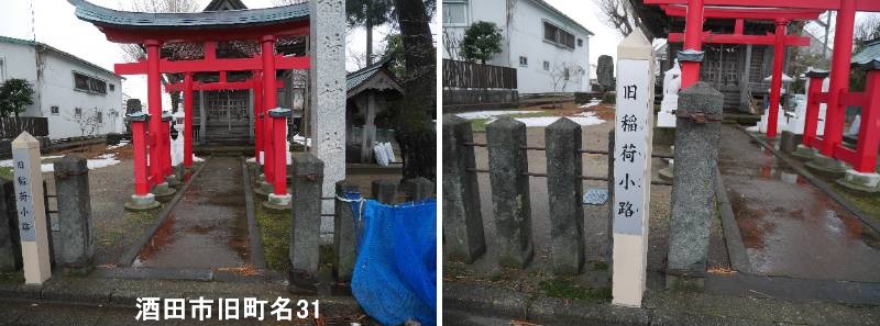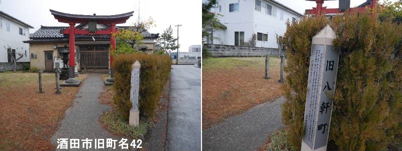 本町一丁目の稲荷神社の入口近くに標柱があります。酒田市旧稲荷小路とは、かつて「竜徳稲荷神社」を中心に発展した地域の名称で、その神社の名前から名付けられました。現在も船玉大明神塔(船の守り神)などが残る歴史的な小路(細い道)で、港町・酒田の信仰と暮らしを今に伝える場所です。 猟師たちが海上安全と大漁を祈願して稲荷神社を勧請したのが始まりで、神社を中心に町が栄え、「稲荷小路」と呼ばれるようになりました。稲荷神社は商売繁盛、五穀豊穣、開運出世の神として、また船玉大明神は船の守り神として、酒田の港町文化と深く結びついています。「船玉大明神塔」は船の形をした台座を持ち、船主が船の帆柱に神を納めて祀った「船玉」信仰(船魂信仰)の象徴です。酒田市内には多くの「小路」があり、この稲荷小路もその一つで、古い地図でその名が確認できる歴史的な地名・小路名です。
