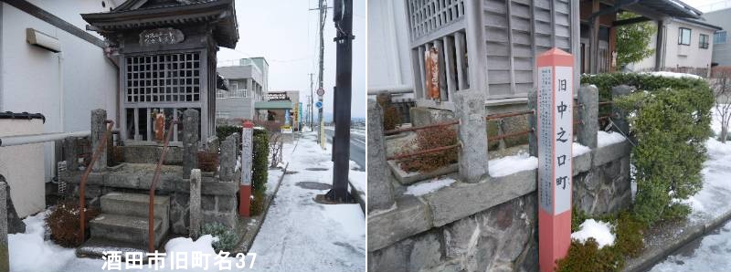 新井田川の中之口橋の袂の観世音菩薩の前に標柱があります。最上氏時代、新井田川筋から城への中の口に位置していたことによります。古くは「中の口川端町(かしげたまち)」と云いました。中の口町とは松山街道から酒田へ入ってくる中の口という意味です。天保年間の「酒田町絵図」には中の口橋はまだないため、幕末から明治初期に初めて架橋されたものと推測されます。木製の中之口橋は老朽化により昭和13年(1938)9月にコンクリート橋に架け替えられた。