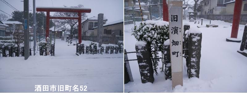 】本間美術館と八雲神社の間にある通り(御成町)に標柱があります。酒田市の旧濱畑町とは、1960年代の住居表示実施で「浜田」や「泉」など現行の町名に再編される前に存在した、酒田湊の繁栄と共に形成された酒田市東部の古い町名の一つで、砂丘地帯(砂原)に家々が建ち並び、後には「新町」とも呼ばれた歴史ある地域を指します。酒田湊の発展とともに、砂丘地(砂原)に人々が住み始め、次第に町が形成されました。砂原が次第に砂山となり、その防風のために簀垣(すがき)を立てたことや、本間光丘の植林による美林(長坂)に由来するとも言われます。要するに、旧濱畑町は、現在の「浜田」や「泉」など周辺の地域を含む、江戸時代から明治・昭和初期まで使われていた酒田の古い地名であり、町の発展とともに「新町」とも呼ばれ、最終的に新しい住居表示に統合されていった地域のことです。