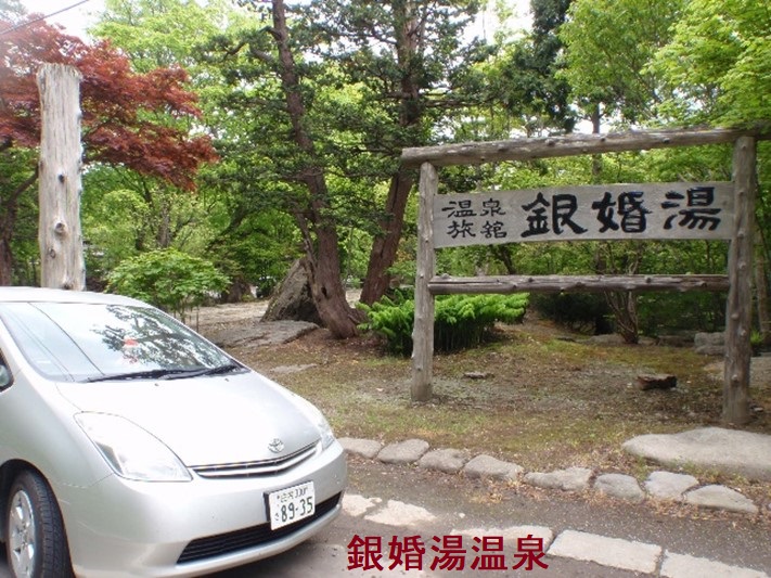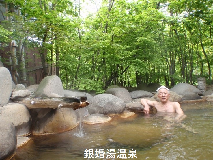 銀婚湯温泉は、落部川中流の中州より湧出する道南屈指の名泉として広く知られています。発見は古く先住民が療養の為常浴していました。戊辰の役に榎本武揚率いる幕軍の負傷者を湯治させ効能があったという事で一躍有名になりました。大正14年5月中州を開掘し大量湧出に成功、あたかも大正天皇銀婚の佳日にあたり、開拓した夫婦の銀婚も重ね命名しました。施設は、山々に囲まれた川沿いに建つ、昔ながらの素朴な温泉旅館です。敷地内から湧出する5本の源泉を用いたお湯がまたすばらしく、大きな岩風呂と木の浴槽の内湯と、川べりには木立の中に露天風呂があります。