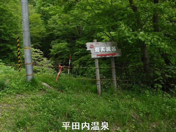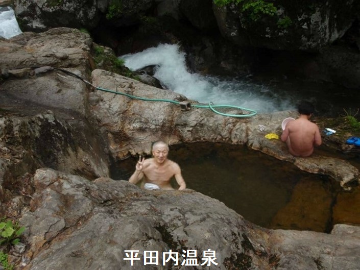 北海道の南部も温泉の宝庫ですが、平田内温泉はその中でも有名な秘湯でです。冷水岳への登山道が始まる林道の終点が平田内温泉の源泉です。ここに大きな岩の窪みがそのまま湯船になった野天風呂があります。湯船は平田内川の渓流沿いあり、道路から野天風呂へ降りる途中に脱衣用のログハウスがあります。脱衣場は男女別ですが露天風呂は混浴になっています。お湯は熱めで、源泉からのお湯は石壁を伝わってきています。湯温を調整するための水は、ホースで谷川の水を引いています。入浴する人が自分で温度調節をする方式です。湯船は4人分程度の広さで比較的浅いです。残念ながら入浴写真はピンボケになりました。