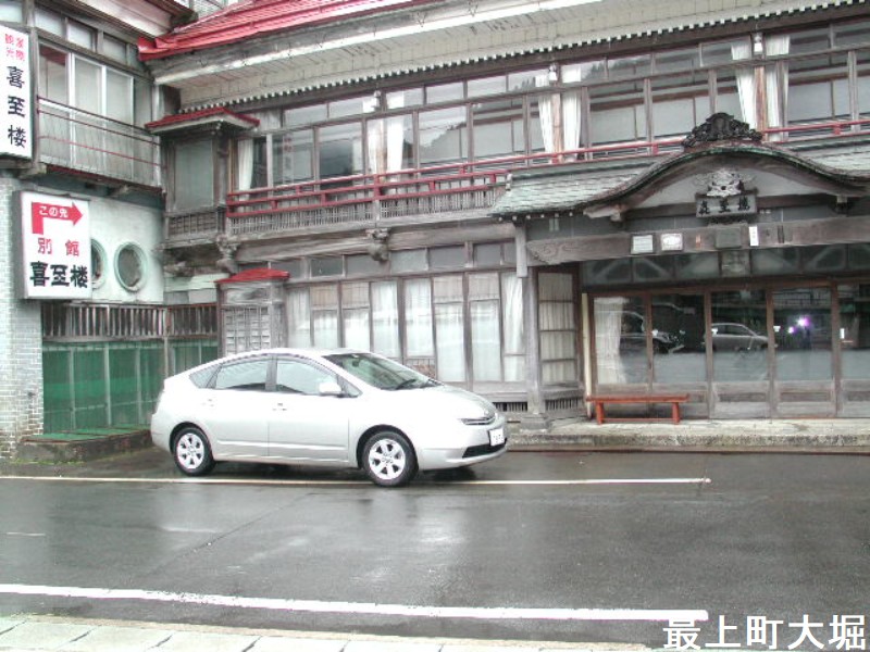 宮城県の古川と山形県の新庄とを結ぶ国道47号線の山形県側は母なる川「最上川」の支流小国川に沿って走っています。その小国川の中流に瀬見温泉があります。この付近は大きな谷になっていまして、その真ん中を流れる小国川に架かる橋を国道より渡りますと川沿いに温泉街があります。橋を渡ってすぐは道幅が狭いのですが、温泉街の中はさほど気にしないで車で入ることができました。その中央部に共同浴場が有りましたが、温泉街を見渡し一番歴史を感じるような宿の門を潜りました。瀬見温泉喜至楼です。