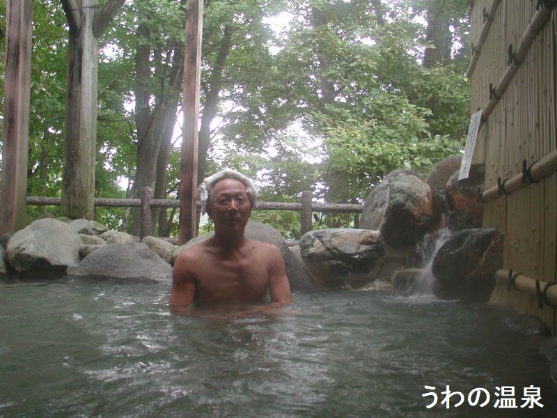 蔵王温泉へ向かう途中、一寸脇道にそれた所に「うわの温泉」が有ります。この温泉は市内の会社が使用していた付近を掘削して、地下800mで掘り当てました。当初無料開放していましたが、その泉質・自然環境を背景に日帰り温泉施設に衣替えをしました。目の前に広がるブナの原生林を望む浴槽は半露天風呂で、少し小ぶりの子供用と二つあります。毎分100ℓの湯が掛け流しになっています。お湯はちょっぴり笹濁りでとろりとした肌触りでした。