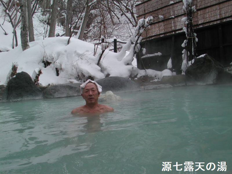 蔵王温泉「源七露天の湯」は蔵王山の西北、標高900mに位置し、スキー場と樹氷で知られている蔵王温泉の中にあります。蔵王温泉は、西暦110年景行天皇の代に日本武尊の東征に従った吉備多賀由により発見されたという伝説が残っています。江戸時代から大衆の湯治場として栄えてきた蔵王温泉に、1998年にオープンした公共の露天風呂がここ「源七露天の湯」です。強酸性の硫黄泉の源泉をかけ流す立ち寄り温泉で、レトロな雰囲気の内風呂と露天風呂を完備しています。美しい自然に囲まれた立地、そして何よりも豊富な湯量が自慢の立ち寄り湯です。
