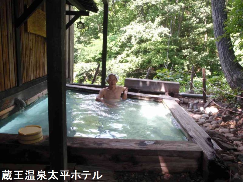 蔵王で初の源泉露天風呂が、源泉100%の掛け流し温泉で蔵王の大露天風呂近くの、高台にあるホテルです。蔵王スキー場が歩いていける自然環境にとても恵まれています。5ッ星認定の源泉掛け流しの露天風呂が自慢です。蔵王温泉は、17人から始まったと言われております。その17人衆の中の一人が、明治時代の初めに、酢川温泉神社の階段口の程近い場所に「辻屋旅館」を開業しました。これが太平ホテルの歴史です。内湯は照明が抑えられ静かな落ち着いた雰囲気です。長方形の浴槽は広さも十分にあります。内湯や露天風呂は同じ源泉で利用環境もほぼ同じです。うっすらと青白く濁り、底には白い湯の華がたっぷりと沈殿しています。硫黄臭がほんのりと香り、露天風呂は、湯温は少し高めです。こちらは浴槽の半分ほどの屋根があり、洗い場はありません。浴槽は木製で内湯の半分程度の広さです。