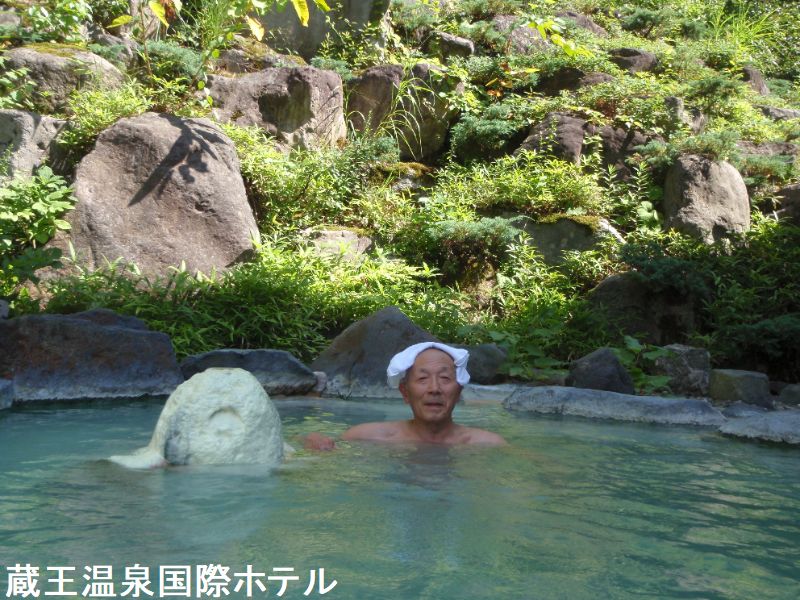 蔵王温泉街の高台に位置し、蔵王温泉で随一の大型ホテルである蔵王国際ホテルは威圧感を感じるコンクリートのホテルです。敷地は一万坪と広く、庭園を自慢としています。内湯の木造の浴室はホテルのものとは思えないほど情緒があり、よく見ると木製湯船に蕩蕩と注がれた酸性温泉が湯船の縁から溢れ出し、鼻にツンと刺激ある硫化水素系温泉は、しっとりつるスベ感をも享受でき、そんな強酸性を忘れさせてくれます。天井、湯船、床面に於いて全て木造と温泉情緒を醸し出した浴室は、温泉好きにはたまらない佇まいです。露天風呂は、風がそよそよと木々を揺らす心地の良い空間です。湯は緑がかった色をし、周辺の森林とのコントラストが美しいです。熱めの酸性泉は思ったよりは刺激が少なく肌がツルツルになります。湯船は上下2段に分かれ上は熱め、下はぬるめとなっています。湯船の淵へは白と緑の析出物が付着していました。