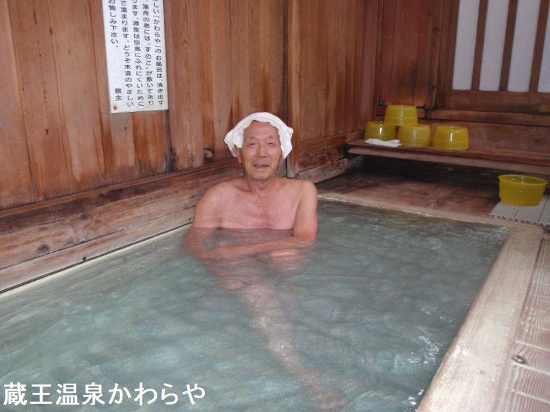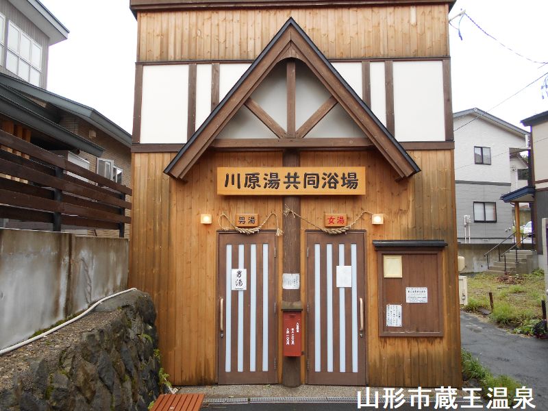 蔵王温泉街の湯の香通りの「すのこの湯かわらや」の隣の奥まったところにあります。駐車場は高湯通りに共同浴場利用者専用駐車場があります。駐車場から川原湯共同浴場がすぐ見えますが、小川を渡らないといけなく橋などが無いけどなんとか行けます。中は小さめな木造で木目のきれいさが印象的です。透明な仕切りの向こうは湯船が見透かせる間取りはほかの共同浴場と共通仕様です。他の共同浴場に比べ湯船が小さめで、お湯は透明度がかなり高く湯底にはスノコ状の板が敷かれ硫化水素の香り漂い、湯の華の堆積もかなりのものです。このスノコの隙間から足元湧出するまさにホンモノ温泉をいただきます。かけ湯をしようと桶を持って手を湯船に付けた瞬間『あつっ!』持参した温度計を湯船に入れて様子を見ていると軽く50度を超えていそうです。湯を混ぜても混ぜても一向に温度は変わりません。当然です。ここは足元から源泉が湧き出すのですから。壁をはさんで男女との湯船はスノコを介してつながっている構造ではありますが、強酸性で超高温泉ですが、ここで引き下がっては日本男子サムライの名がすたる。意を決っして入浴しました。熱くても良いものはやはり良い湯です。