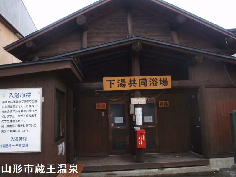 共同浴場 下湯」は、蔵王温泉のメインストリート「蔵王ライン」から. 観光協会横の細い坂道を150mほど上がったところにある共同浴場です。蔵王温泉は山形県山形市南東部、蔵王連峰の西麓にある温泉で、標高の高い位置にあることから白布温泉、福島県の高湯温泉と共に奥羽三高湯の一つに数えられます。その泉質は強酸性泉で、下湯共同浴場は蔵王温泉に3つある共同浴場の1つです。木造のいかにも共同浴場といった造りは上湯と同じです。浴室は、換気のためか脱衣場や浴室ともに風が吹き込みます。桶で湯をすくえば、なんか少しぬるい感じです。かけ湯した後、湯船に身を沈めれば私にとっては適温のお湯でしだ。小さいながら比重のありそうな白い湯の華が湯船の底に沈殿し、湯をかき混ぜるとフワフワ舞い上がります。透明感のある湯は見た目に青白く映る極上湯で、わずかにツルっとした感覚の中にも酸性の肌を引き締めるのが印象的です。全て木造の共同湯の雰囲気も素晴らしい温泉でした。