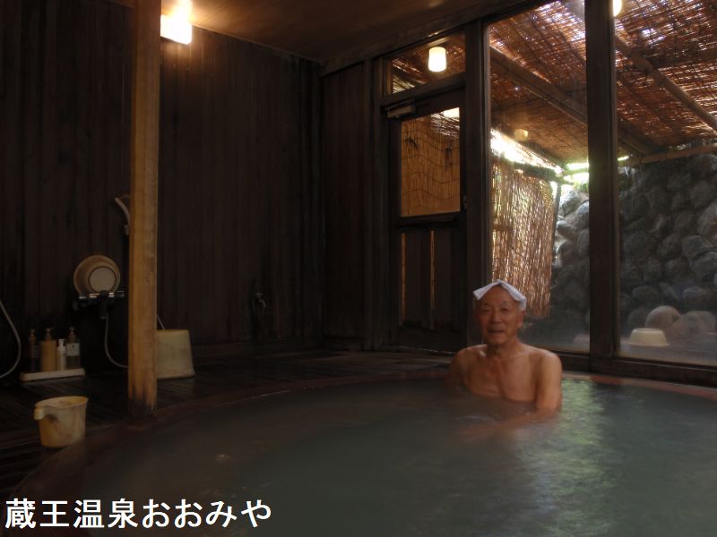 山形県蔵王温泉にある「おおみや旅館」のお風呂は、100%源泉掛け流しの天然温泉です。蔵王温泉は、開湯西暦百十年、いまから1900年ほど前、日本武尊の東征に従った吉備多賀由により発見されたという伝説が残っています。蔵王温泉と言えば強酸性泉のにごり湯で有名な温泉ですが、その中でもピカイチの泉質だと噂されています。浴室は正面に大きな窓があるので明るく,全木造の湯小屋風で情緒があります。3~4人程入れる大きさの木製浴槽が2つ並んでありました。向かって右側は高温浴槽で、湯口からドバドバとお湯が注がれ掛け流しになっていました。微白濁で硫黄鉱物臭のあるお湯は つるすべとした浴感があり新鮮そのものです。結構熱いので、肩まで浸かれるのにはギリギリの湯温です。左側の浴槽は、一段と熱い超高温浴槽です。湯口は浴槽内にありますが、ドコドコとお湯が注がれているのが感じられます。お湯は常に浴槽から溢れ、洗い場に流れ続けています。この周辺の床だけが 付着したお湯の成分により色が変わっていました。外のおまけ的なスペースには5人程が入れる大きさの露天風呂があります。囲いと葦簾屋根があり,景観は望めませんが、外のひんやりとした空気の中で入浴を楽しめます。湯口からはお湯がトポトポと注がれ、軽い掛け流しになっています。青色を帯びた白濁で湯温はと温めの浴槽になっており、内湯と比較して鮮度はあまり良くありませんが,唯一 ゆっくりと浸かれる浴槽でした。