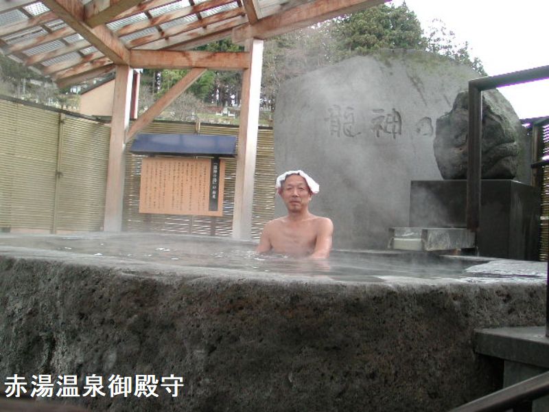 今から900年程昔、奥州統一を夢見た源義家の弟義綱が出羽の平師妙の乱の際、草刈八幡のお告げにより発見し、傷ついた兵士を湯に入れた所、温泉は傷からの血で深紅に染まったところから、赤い湯、赤湯となったと言われています。山形県の置賜盆地の北端に位置し白竜湖北西の斜面には広大なぶどう園が広がっています。御殿守は上杉家の別荘 「赤湯御殿」が始まりです。この地には赤湯七水の一つと言われる名水が湧き出ておりました。当時の人は、そこに龍神と道祖神をお祀りし龍神水と呼んでいました。そこで日本一の大石風呂を健康と長寿を願い「龍神の湯」と命名したそうです。御殿守の名物は大きな岩風呂です。この原石は、南蔵王山麓より採取したもので、安山岩、通称蔵王目透き石と言われているものです。原石の重量は100トン余り、縦5m横4m高さ5mあり、上の部分三分の一を切り取り、中をくり抜いて作ってあります。