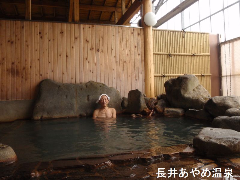 長井あやめ温泉桜湯は、国道287号線(長井大橋)から西へ約5キロ、標高265mの高さにあり、 朝日連邦が連なる山々の懐に抱かれ、長井市街をはじめ置賜盆地が一望に広がる。風光明媚な温泉です。2015年に機械の故障などの理由から休業されていましたが、地元の手塚建材さんが引き継ぎ、運営会社を立ち上げて再オープンしました。 露天風呂的ワイルドな岩風呂は、岩場からお湯が注がれており、丸い土管の中へお湯が流れ出る仕組です。お湯は黄緑色をしており肌をこするとかなりキシキシする感じです。