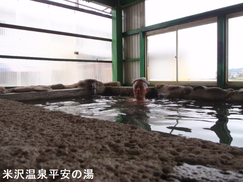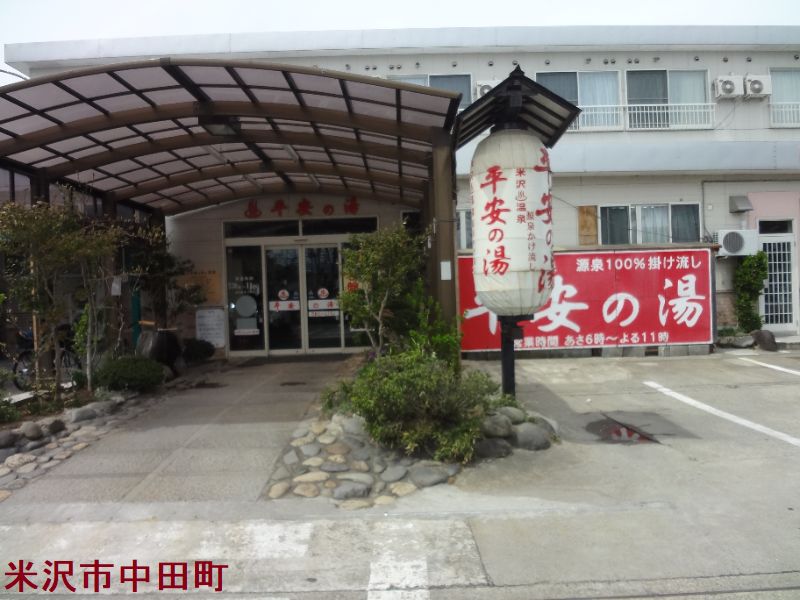 米沢温泉 平安の湯 は山形県米沢市にある日帰り温泉施設です。国道13号など方々で看板を見かけますが、分かりにくい場所にあります。米沢市街地から県道101号(羽州街道)を北上してくると分かり易いと思います。真っ白な2階建ての建物で1階部分が温泉施設、2階部分はハイツ平安で住居になっています。館内は庶民的なスーパー銭湯のような雰囲気でカットハウスやリラクゼーションも入っていました。名物の米沢ラーメンが食べられる食堂もあります。玄関の壁には温泉分析表が掲示されていました。内湯は10数人サイズの大浴槽があり、浴室に入るとガスっぽい香りを感じるのですが、お湯は無味無臭です。温泉は源泉かけ流しで使用されていて、湯温は結構熱めになっています。水道のホースが浴槽内に伸びていて、無理やり加水して温度調整してるようです。露天は20人サイズの岩風呂があります。露天への経路が内湯を出てからいくつか段差があったりするのが、手作り感を感じます。露天と言っても完全に屋根がついていて、室内の雰囲気だったりしますが、窓の外はのどかに畑が広がってます。お湯は内湯と違い少し黄色く色づいて見えて、多少の肌への泡付きがあります。温度は少し低めになっていて、入りやすかったです。