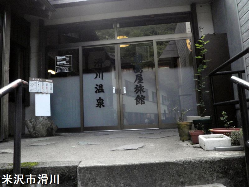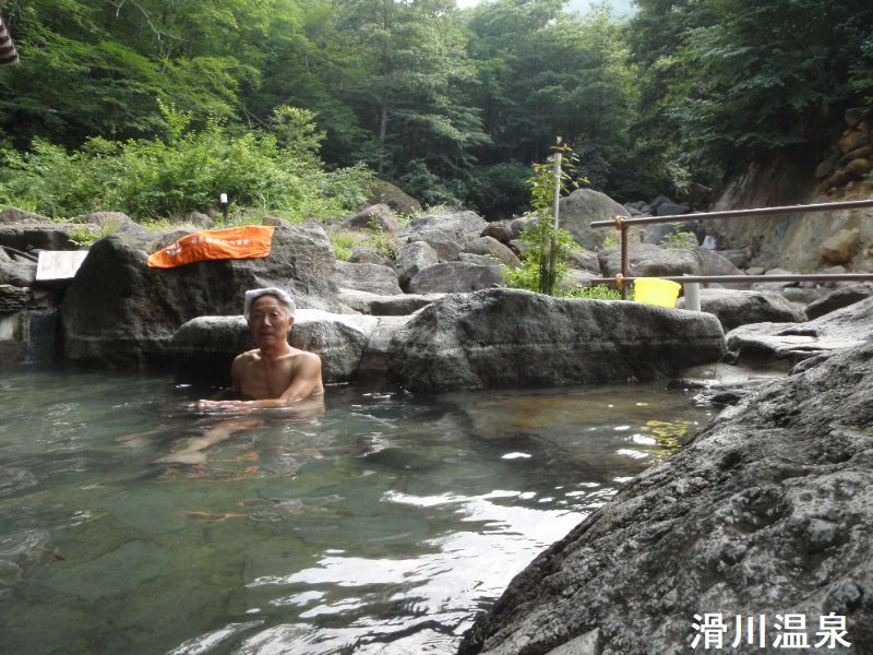 米沢十湯のひとつ滑川温泉は、500年ほど前に平家の侍斉藤盛房が前川で滑って転んで温泉を発見したという由来があります。開湯はそれから200年以上たった宝歴13年のこと。当時の上杉藩主の許可を得て、一軒宿の福島屋は湯治場として栄えてきました。今も最上階3階に殿様用の部屋が残されており、ここに泊まれば四方を見渡すことが出来ます。混浴の内風呂は、天上が高い木造で、湯船は石造りの見事なものです。薄い乳白色の源泉がかけ流しされ、非常に良く暖まるお湯です。露天は古くからある大きな岩風呂と後から造られた檜風呂の二種類で、基本は混浴ですが、女性専用時間も設けています。この岩風呂も素晴らしいの一言です。紅葉の木々や渓流を望みながら若干ぬる目のお湯に浸かっていると、時を忘れてしまいそうです。