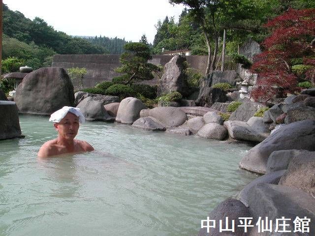 中山平温泉の開湯は元和・寛永の頃、玉造り十五湯の奥の湯として大沼の遠祖が開いたとされています。硫黄泉、食塩泉、重曹泉、単純泉など多彩な泉質をもつ鳴子温泉郷にあって中山平は最大の湯量を誇ります。この地の鳴子峡は紅葉に覆われる頃、川沿いの散策道からの眺めはまさに絶景です。仙庄館は鳴子温泉から鳴子峡を5km程さかのぼった豊かな森や清らかな渓流を背景に建っています。歴史有る中山平温泉の中で最も規模の大きい施設です。仙庄館の露天風呂は乳白色の熱いお湯が惜しみもなく多量に注がれています。そして廻りを見渡すと、良く手入れされている庭が!日本庭園の中にある露天風呂なのです。一方は渓流がながれていて、そのせせらぎの音も風流です。ここでの湯浴の一時は何ものにも代え難い幸福感がありました。