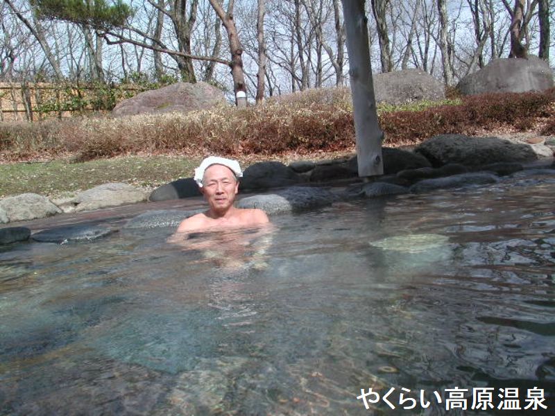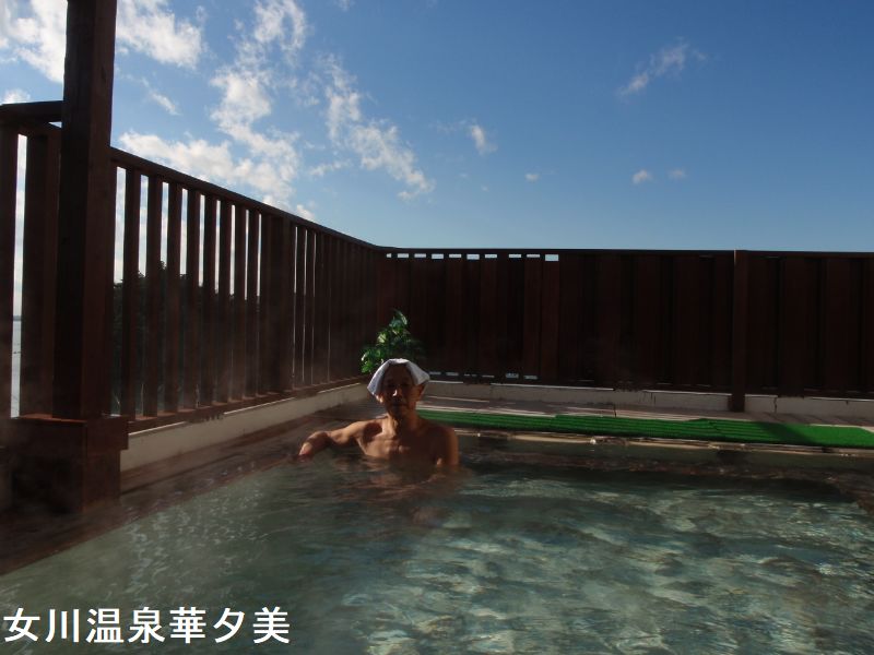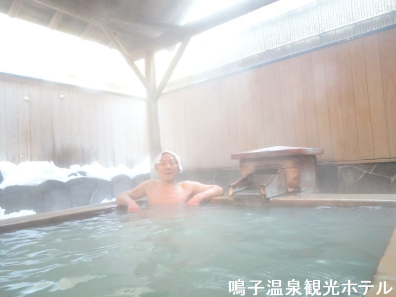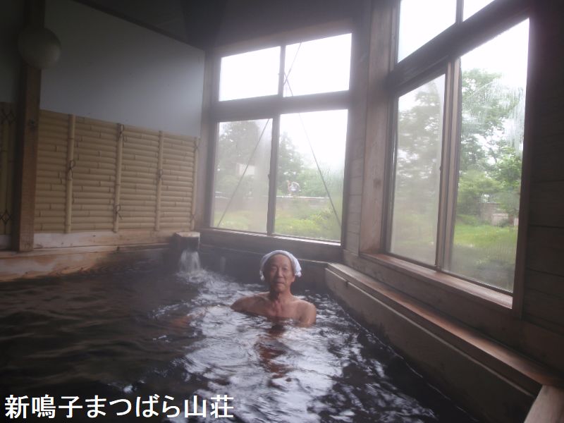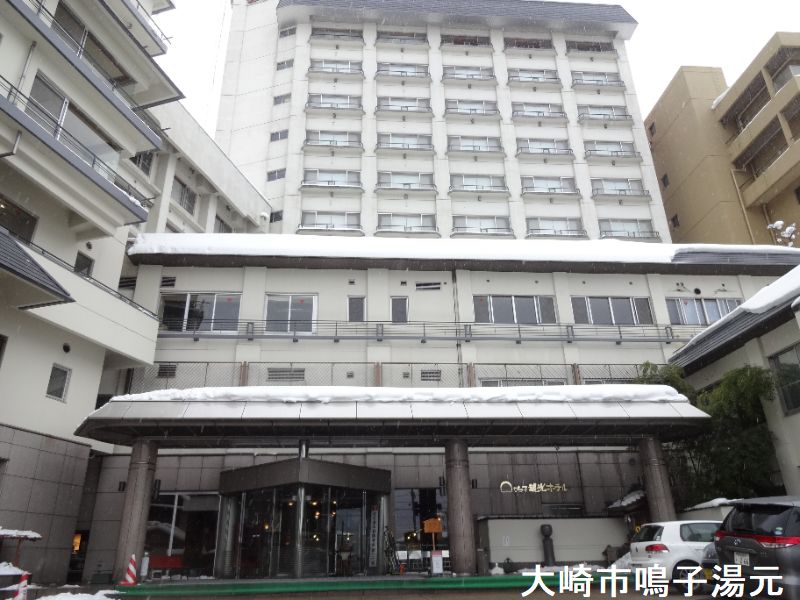 JR鳴子温泉駅から徒歩4分の鳴子温泉街にあるカジュアルな温泉旅館です。板塀にこけしをかたどったライトを備えたエントランスと、中庭に面した明るくモダンなロビーがあります。浴室は8階にあります。「天馬」と「天翔」という2つの浴室があり、日替わりで男女が入れ替わるようになっています。浴室に入ると、消毒用の塩素の匂いが感じられます。内湯の浴槽は大きく、30人程度が入れる広さです。大きな木製の湯口からは熱めのお湯が注がれています。湯温は適温、無色透明のお湯で、時折「ふわっ」と硫黄臭がしてきますが、浴室全体に塩素臭がしているためにあまり感知できません。浴槽の中では、細かな湯の花がチラチラと舞っています。全体として、とってもマイルドな感じのお湯です。窓側に設けられた排出口から、溢れたお湯が外に流れ出していますが、循環と掛け流しが併用されています。8階にあるので、窓からの景色は抜群です。温泉街や遠くの山々が一望できます。露天風呂に向かう。露天風呂は、浴槽は小さくて4人サイズです。湯口からは熱いお湯が注がれています。こちらは、掛け流しとなっており、溢れたお湯は浴槽の縁から外に流れ出しています。消毒用の塩素の匂いもほとんど感じられない。内湯からの眺めも良かったが、露天風呂からの眺めはとても良いです。