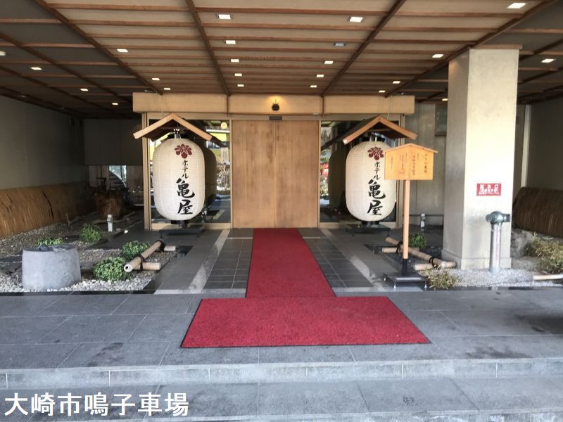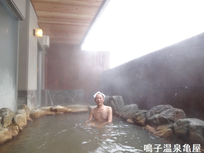 鳴子温泉郷には日本にある 11種類の温泉の種類のうち 9 種類が揃っています。その天然温泉の源泉かけ流しの風情豊かな露天風呂と内風呂、さらに鳴子の里山の四季折々の自然が一望できる展望大浴場が亀屋の自慢です。鳴子の外れ、鳴子パールホテルの並びにある立派なお宿です。鳴子温泉には11種の温泉が湧出しています。亀屋は名物「黒湯」があり、初めての方は匂いと色に驚きますが、おなじみ客には長く愛されてきました。浴室に入ると東鳴子温泉でよく出くわす鉱物油のような匂いが充満していました。内湯・露天ともにやや熱めの湯加減となっており、油臭は室内空間である内湯の方が強かった一方で、露天風呂は金気が比較的明確でした。露天は岩風呂で、奥の湯口からポコポコと音を立てながら熱い源泉が投入されており、その流路は黒光りしています。内湯同様にこちらも放流式の湯使いであり、浴槽のお湯は手前側の穴から床へ流れ出て排水されていました。熱めのお湯ですが、外気のおかげで火照った体が適度に冷却されますから、暑い季節には露天で湯あみをすれば爽快です。