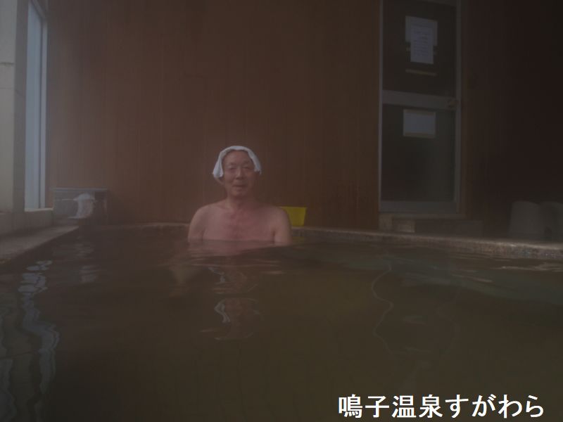宮城県にある鳴子温泉郷、なんと1000年近い歴史を持っています。かつての偉人である源義経や松尾芭蕉などもこの温泉郷を利用していたとの事です。そんな鳴子温泉の源泉100%かけ流しを楽しむ事ができるのは、旅館すがわらです。当旅館は温泉が目玉になっており、美肌効果のある温泉として以前に何度かテレビ放送もされています。場所は、鳴子温泉の国道47号線の新屋敷の交差点を駅方面へ県道170号線に曲がるとすぐ突き当たりにあります。大浴場は、3段になっており、中段のステップには豆タイルが敷き詰められています。温泉は100%源泉そのままです。源泉温度が高いために湯船がかなり熱くなっていることが多く、脛までお湯に入ったところ、皮膚にピリピリとした刺激が走る湯加減でした。お風呂の掲示には「必ず湯もみなさってからご入浴して下さい」と書かれていました。その案内に従い、湯船の脇に立てかけられていた湯もみ棒でしっかりお湯をかき混ぜたところ、加水することなくちょうど良い湯加減に落ち着きました。白い析出がこびりついている石の湯口が2つあり、それぞれからお湯が注がれていました。浴槽の大きさに対して投入量が少ないように見えるのですが、上述のように温泉の温度が高いため、加水をせずに温度調整すべく、湯量を絞っているものと思われます。露天風呂は、日本庭園風の空間に石造りの丸い浴槽が一つ据えられ、筧からお湯がチョロチョロと落とされていました。内湯もこの露天風呂も同じ源泉を引いているのですが、やはり環境によってお湯の見え方が異なり、内湯で瑠璃色に濁ってお湯も、露天風呂では淡い青白色の貝汁濁りを呈していました。
