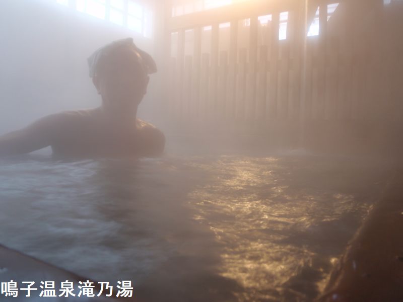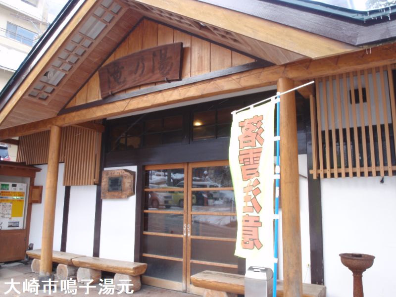 鳴子温泉街の山の手に温泉神社があり、その下に鳴子温泉のシンボルである共同浴場、滝の湯があります。千年の歴史を持つ古湯で、滝の湯のお湯は温泉神社の「ご神湯」を引いています。建物は江戸時代の湯小屋を再現した風情ある木造建築で、地域の人々から旅行者まで、たくさんの人から親しまれている公衆浴場です。白濁したお湯と板張りの浴槽で、昔ながらの懐かしい雰囲気が漂っています。浴室は総ヒバ造りで落ち着いた雰囲気です。湯船は大小2つに仕切られています。お湯は白濁していて、やや熱いく、柔らかく気持ち良いお湯です。お湯をなめてみると少し酸っぱいです。建物の裏に源泉があって、そこから何本もの太い丸太の樋でお湯を導いています。この樋から落ちるお湯が打たせ湯となっていて、打たせ湯はぬるめにしてあって長い時間打たれるのにちょうどよいです。