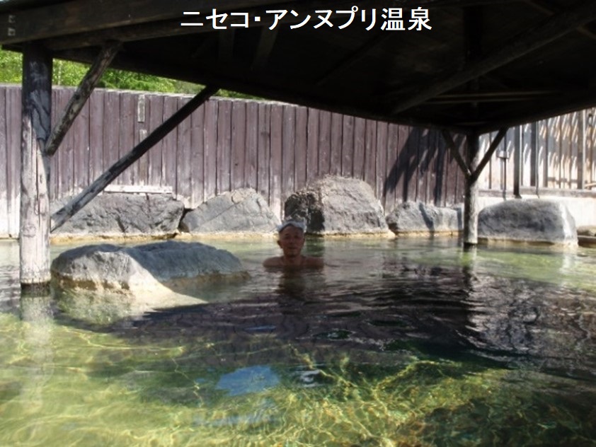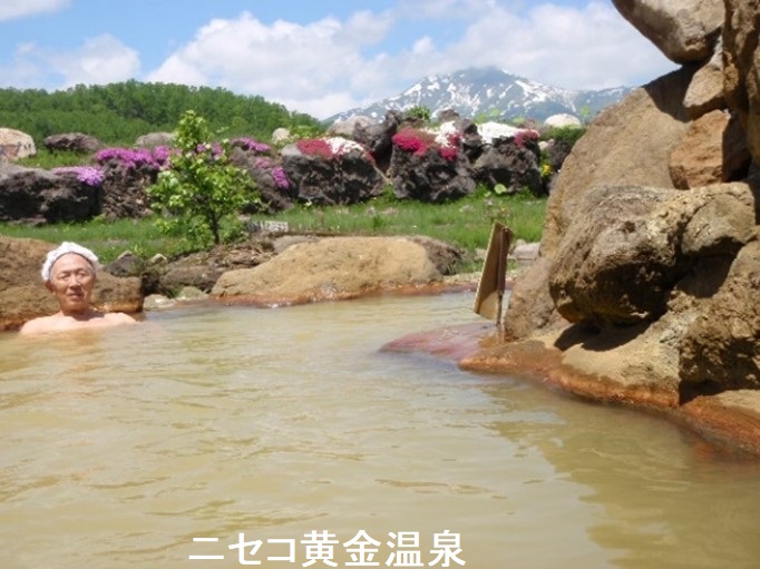 ニセコ黄金温泉は1軒だけポツンと建った日帰り温泉施設。建物は畑に囲まれ、80歳近い林さんご夫婦が経営しています。元々は農家で、農業用に掘削したら温泉が湧きだし、自宅の敷地に手作りの温泉施設を作っちゃったそうです。全て自前で作ったというから驚きます。そんなニセコ黄金温泉は開放感に溢れる半混浴露天風呂と源泉掛け流しのお湯が有名です。それらを求めて多くの温泉ファンが訪れることでも知られています。浴場には内湯が1つ、大きい露天風呂が1つ、小さい露天寝湯が1つ、露天壺湯が2つあります。温泉は酸化して、混濁の黄土色に変化しているので、丁度いい感じで身体を隠すことができます。温泉はぬるく、長湯に最適で、何も考えずにボーっと羊蹄山を眺めているのは至福の時間です。