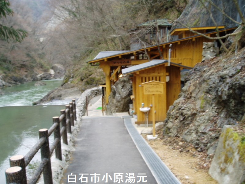 白石川のせせらぎが響く豊かな自然に包まれた温泉地です。かつらの湯は、「旅館かつらや」向かいの駐車場へ車を停め遊歩道の案内板に従って渓谷沿いに歩いて行きますと、真新しいヒノキ作りの立派な入浴施設があります。昔から自然湧出する湯殿が有りましたが、洪水の土砂で埋まってしまいました。それを白石市が再建したものです。かつらの湯の手前には白石川に架かる赤い吊り橋があり、吊り橋を渡ると景勝地の「碧玉渓」を散策する小原温泉遊歩道があります。この遊歩道を15分くらい歩いて行きますと洞窟のある「かもしかの湯」が有ります。