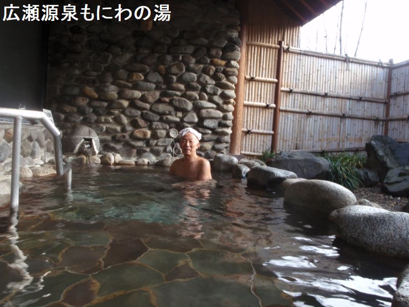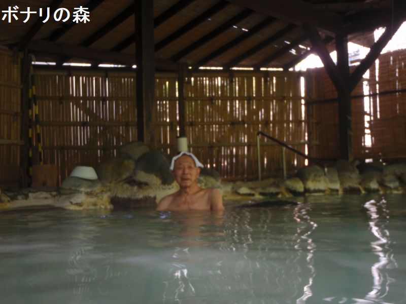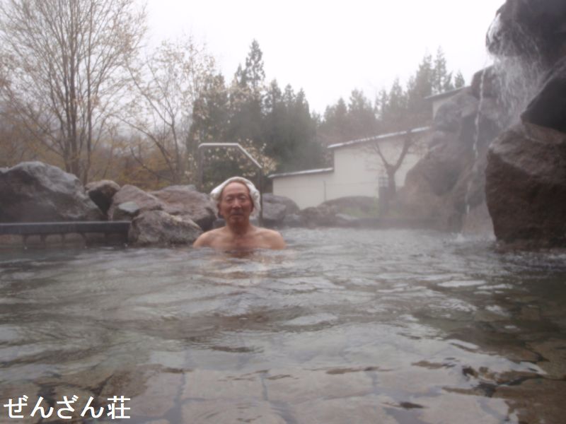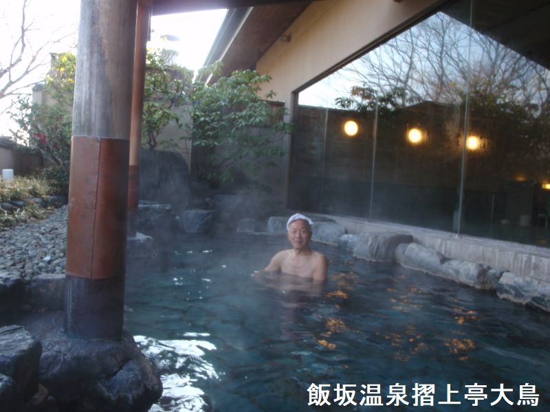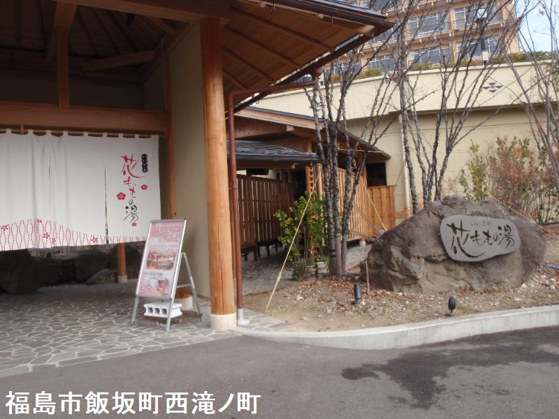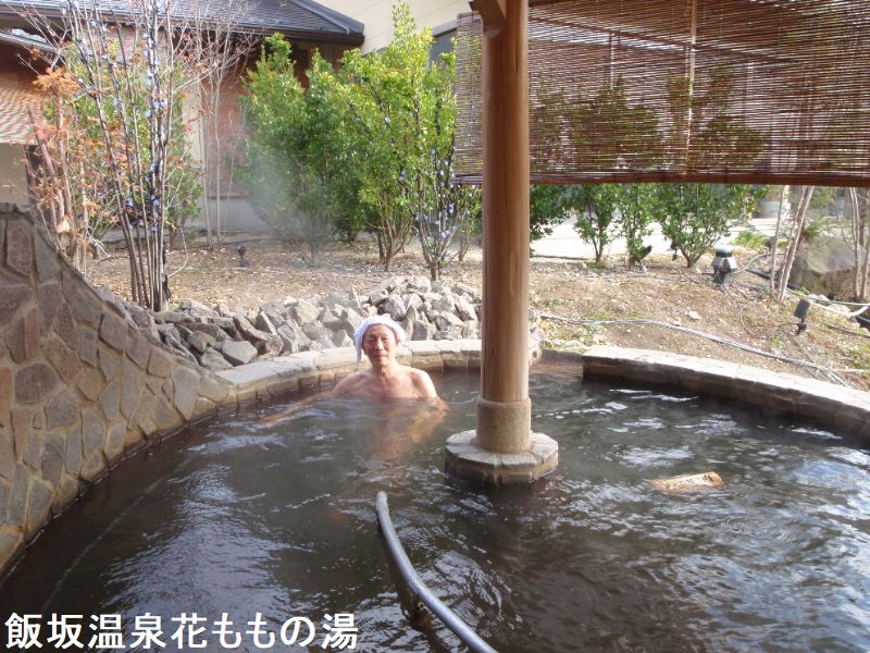飯坂ホテル聚楽に隣接する同経営の大型日帰り温泉施設が、いいざか 花ももの湯です。内湯は10人弱入れる湯船が3つ並んでいて、手前からほどよい、熱湯、ぬる湯と温度で分かれています。お湯は透明で、多少塩素臭を感じます。露天も湯船が3種類あり、こちらは泉質で湯船が分かれています。手前が「もみほぐしの湯」で、ジェットバス付きの4人ほど入れる岩造りの湯船です。お湯はやや薄黄緑っぽい透明の湯で、多少赤茶色の湯花が舞っています。使われているのは「花月の湯」という源泉です。真ん中は「立ち見の湯」です。水深が深いので階段があり、お湯も濁っているので床が見えなくてちょっとコワイ感じもします。深い湯船ですが、立っても胸より下ぐらいまでしかつかれない程度の深さです。しかし真ん中に腰掛けがあり、これに座ると丁度良く肩までつかれて、目の前に広がる庭の景色が堪能できます。お湯は緑で濁りがあり、湯花も少し舞っています。使われているのは「延寿の湯」という源泉で、内湯ではこれを循環で使っていますが、こちらは源泉かけ流しです。一番奥は「寝ころびの湯」で、お湯は薄茶色の透明ですが赤茶色の湯花が非常に大量に舞っているのが特徴です。こちらの源泉は「坐忘の湯」でした。