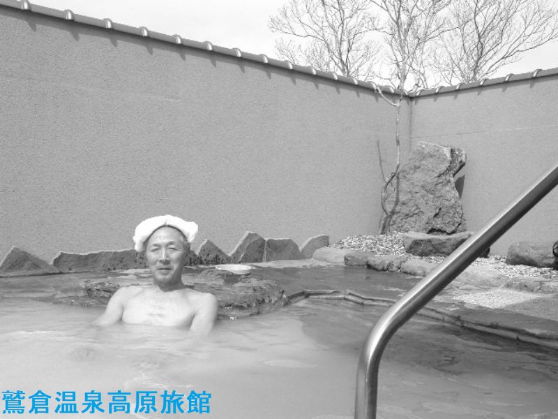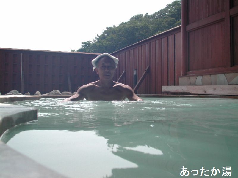 花月ハイランドホテルは、信夫高湯では意外な穴場です。この温泉地は玉子湯旅館が有名ですが、このホテルだけ谷底の信夫高湯温泉街より少し高台にあるため、展望が違います。夜の福島市外の夜景や満天の星が眺められ、早朝は吾妻小富士が朝焼けで染まるのが楽しめます。風呂は内湯2、露天1です。本館がロッジ風の建物なのに、風呂は一貫して和風です。内風呂は広く、カランも温泉です。窓からは、山腹の大森林が広がります。内湯は大きな窓ガラスが張られ、開放的です。きれいな乳白色で、太陽があたると白砂のような光が水面中にきらめくのが大変きれいです。露天風呂は、内風呂の外のテラスから階段を下りていきます。吾妻小富士側の斜面を眺める展望風呂です。温泉の成分で木製の柱や屋根は黒く染まり、いい雰囲気になっています。特に夜は電灯が二つしかないので、ほの暗くよい雰囲気です。乳白色ですけれど、青みがかった湯は、体に染み込むようなじっくり感があり、湯後はさっぱりで、体に熱はこもりません。湯は熱くはありませんが、長湯するには体にこたえすぎるように思います。