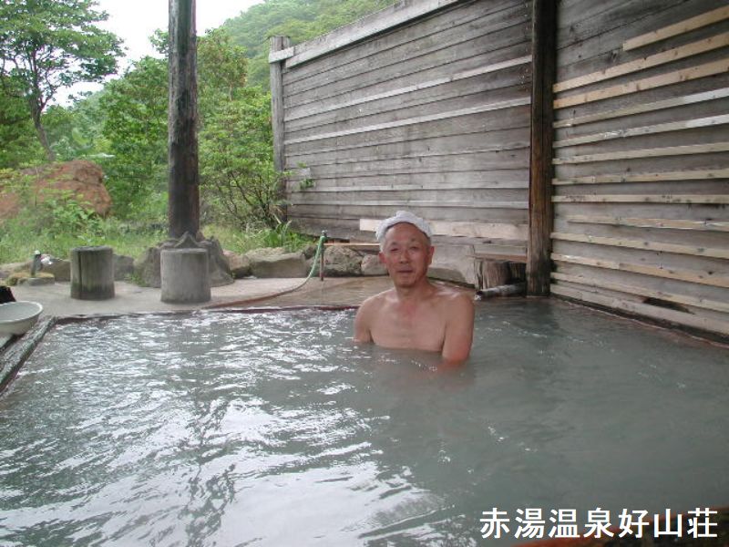 赤湯温泉は、新野地のバス停から300mほど下がった比較的明るい樹海の中にあります。東吾妻の南の斜面を独り占めしたような世界です。周辺はブナの原生林で、五月中旬にはこの木立の中が水芭蕉とリュウキンカ一色になるという高山植物帯なのです。庭先に水芭蕉が咲くという温泉は珍しいですね!温泉は、裏庭に自噴する鉄分を含んだ湯が、宿のご主人の手作りの湯船に溢れています。施設の前の方にもう一つ露天風呂の案内が有りましたので覗いてみると、硫黄の香りがする露天風呂がありました。