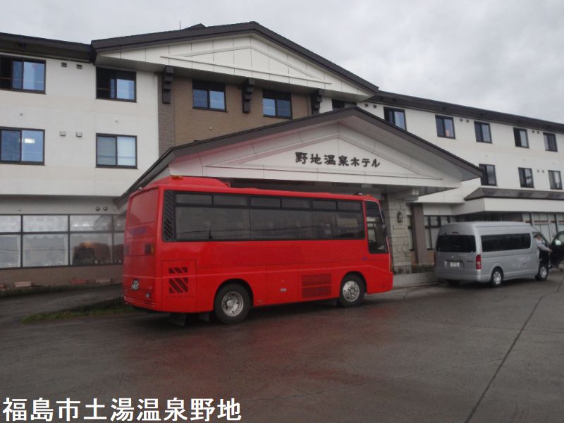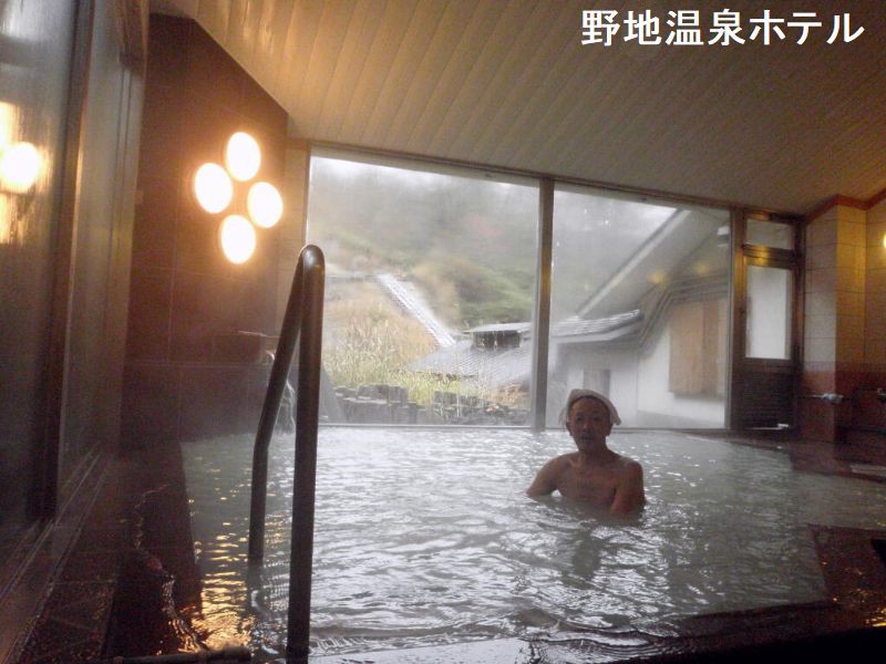 安達太良連峰の秀峰、鬼面山を背に、福島市街を一望する高台に野地温泉ホテルは白い姿を現しています。1868年に湯治場として始まり、1989年に現在の近代的なホテルとして生まれ変わりました。湯治場の面影を今に伝えるのが、「千寿の湯」です。木枠で仕切られた3つの湯船が並び、奥から順に温度が下げられており、ついつい長湯となってしまいます。地元の銘石、鮫川石を配した露天「鬼面の湯」、内湯と露天がひとつになった「天狗の湯」など、湯めぐりも楽しい。どの風呂も白濁した硫化水素泉です。内湯「千寿の湯」は、近年、以前の形を継承しながら改修されたようです。滑り止めを兼ねる細い丸みを帯びた板が敷き詰められた床がとても美しいです。ホテルでは「面白露天風呂」と謳っていますが、内湯から入浴したまま露天風呂へ行ける天狗の湯は、特に冬は寒さに震えながら、露天風呂にかけ込むような事はしなくていいので有り難いです。安達太良連峰の最北に位置する鬼面山へは、野地温泉から徒歩1時間ほどの距離にあります。この山に因む鬼面の湯は、20人位が一度に入れるかなり大きなものです。平らな天然石を敷き詰め、浴槽を跨がないで入浴出来る風呂の造りは、他にあまり例を見ない独特なものです。