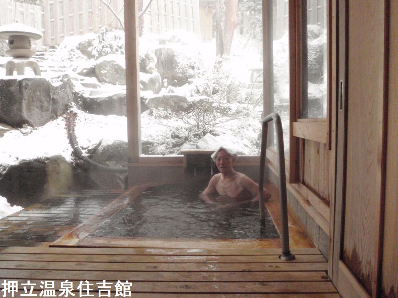 押立温泉は日本百名山にもなっている津磐梯山の麓にあり、猪苗代湖や猪苗代スキー場からも近い大自然の中に位置しています。住吉館は、大正9年に開湯された湯治場だった宿です。朱色のトタン屋根の建物外観からは鄙びた宿を想像しましたが、館内は外観から受ける印象を覆す、綺麗で落ち着きのある装いです。二室ある内湯はそれぞれ「梢の湯」「小滝の湯」と名付けられており、男女入れ替え制になっています。窓外の緑を眺めつつ、ただ湯船へお湯が落ちる音ばかりが響く浴室で、静かにじっくりと湯浴みすることができます。窓のすぐ外には小さな露天風呂が据えられていました。1人でいっぱいになっちゃいそうな大きさでして、こちらには無色透明でややぬるめのお湯が張られていました。