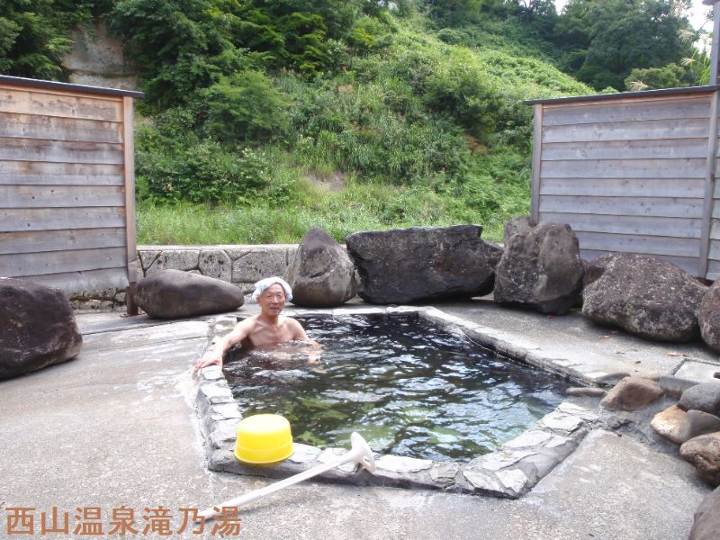 西山温泉には、8つの源泉がわき出ており、最初の神の湯の発見は養老元年(717年)と言われてます。滝の湯の創業は明治32年(1899年)滝の湯と荒湯の2種類の源泉を川向いより引湯してます。川音を聞きながら、季節を感じられ、春の桜、夏のカジカ、秋の紅葉、冬の雪と、四季折々に楽しめます。川側に浴室棟があります。浴室は2つあって、左右で泉質が違います。右の浴室は荒湯源泉、左の浴室は滝の湯源泉です。右の浴室は、源泉は熱いので湯枡に溜めてから少しずつ注がれています。当然源泉かけ流しです。お湯は透明で熱めで、薄い塩味がします。さらりとした浴感で気持ちがよいです。窓は広いですが、堤防があるので川は見えません。左の浴室は滝の湯源泉で、こちらもかけ流しです。お湯はほんのり黄色みがかった透明で、かなり熱いです。お湯はトロリとした感じ、ツルスベ感もあります。露天風呂は浴室棟の右にあります。混浴で、浴槽は結構大きいです。お湯は荒湯源泉だと思います。川の音が心地よく、静かにお湯を楽しむ事ができました。