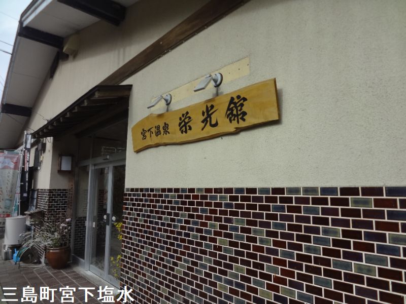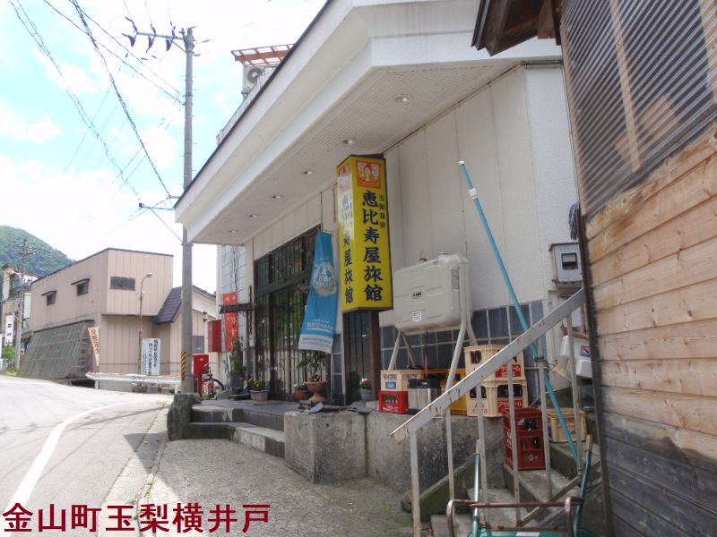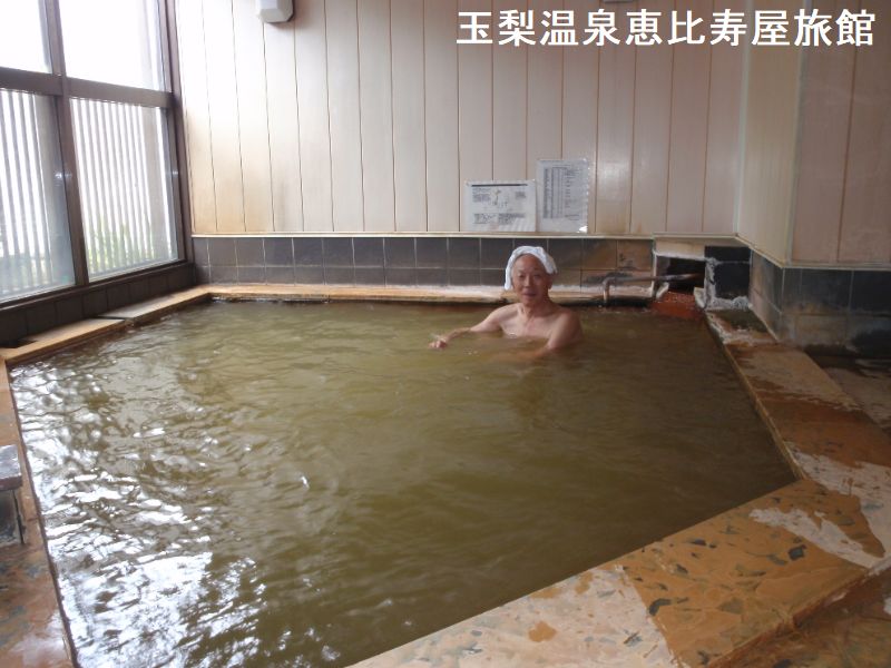 国道400号線と野尻川に挟まれた細長い敷地に、シンプルな鉄筋4階建ての恵比寿屋が立っています。男女別の内湯と露天風呂の他に、木をくり抜いた名物の貸切露天風呂があります。「河童の湯」と名付けられた恵比寿屋旅館の男女別の浴場は、五角形4~5人サイズの浴槽です。一般的には浴槽が広いと嬉しくなりそうですが、源泉かけ流しの温泉の場合、浴槽の湯の入れ替わる頻度が高いほどフレッシュな温泉を味わえます。お湯は赤みがかった茶色になっていますが、光線の具合で鶯色に見えたりします。縁どった石に温泉成分が付着して風情を増しています。それほど熱くなく、心地よく長湯できます。外には3人サイズの露天風呂が野尻川を見下ろすように設えてあります。内湯、露天風呂共に対岸で湧き出す玉梨温泉の源泉が引かれています。ミネラルが豊富で緑褐色に濁る湯はとても温まります。
