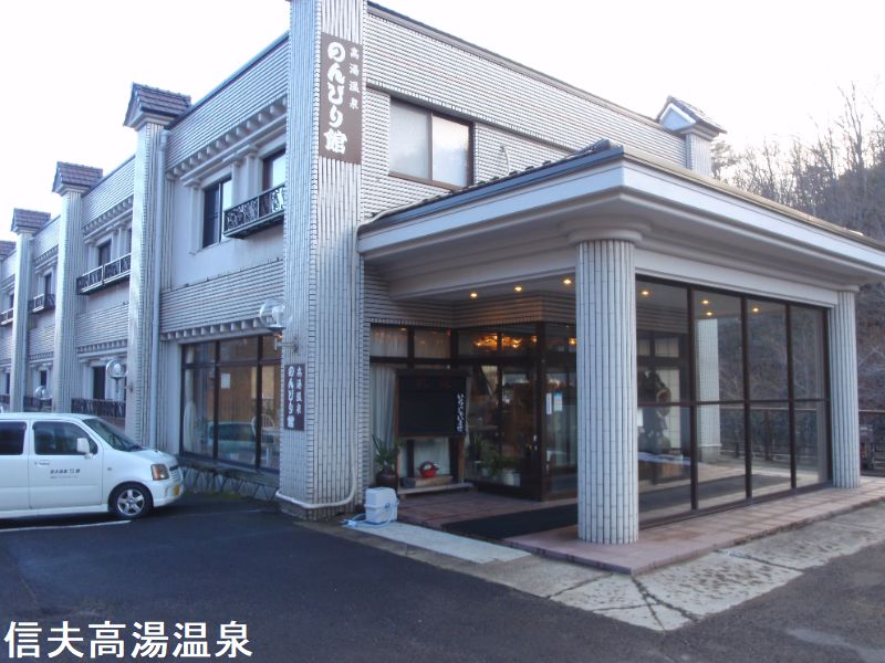 信夫高湯温泉のんびり館は、源泉100%掛け流しの乳白色の硫黄泉が自慢の宿です。温泉奥州三高湯のひとつ、自然湧出の温泉として、開湯400余年の歴史を持つ東北屈指の名湯です。場所は、玉子湯とひげの湯の中間地点にあり以前企業の研修施設だった所が「のんびり館」に変わりました。浴室があるフロアは、階段を下りてすぐ右手は露天風呂用出入口、左斜め前が内湯、更に左奥へ廊下を進むと家族風呂というようなレイアウトになっています。内湯は、広い浴槽が青白い濁り湯を湛えています。湯口から落とされる硫黄のお湯は湯船を濁らせながら満たし、オーバーフローしています。露天は、専用の出入口にて下駄に履き替えます。そして歩いて露天へ向かいます。ゴールまではわずか数十メートルですが、結構な勾配のある下りステップになってます。白濁した湯船が目に入ってきました。屋根掛けされているものの、川に向かってオープンになっているので開放感はまずまずです。湯口から流れ落ちる硫黄の湯によってその流路は薄い黄色に染まっています。そして、しっかりオーバーフローしていました。