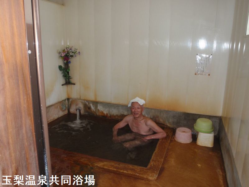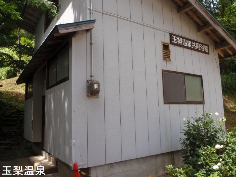 柳津方面から国道252号線で横を流れる只見川を遡行し、JR只見線の会津川口駅前で左折、国道400号線に乗り換えて野尻川に沿って5kmほど走ると玉梨八町温泉に至ります。国道沿いの橋を渡った先に玉梨温泉共同浴場があります。この共同浴場は、本当に小さな湯小屋ですが、これでも男女別の風呂があり、浴室・浴槽はこれ以上ないシンプルなコンクリート造りです。浴室は、3~4人サイズの浴槽に源泉がドバドバと贅沢に掛け流されており、常に新鮮な状態で楽しめます。いかにこのお湯が新鮮であるかは体に付着する気泡が証明してくれます。お湯は無色透明ですが赤褐色で粒子状の非常に細かい湯の華が無数に舞っているためほんのり赤く濁って見えます。このため浴槽や洗い場のコンクリートにはは温泉成分がしみこんで赤く染まっています。口にすると旨味だし味に塩味と炭酸味・甘みが混じった複雑な味が感じれ、金気の香りがやんわり匂います。湯加減は日のよって若干異なりますがやや熱めで、体に熱が篭る泉質です。